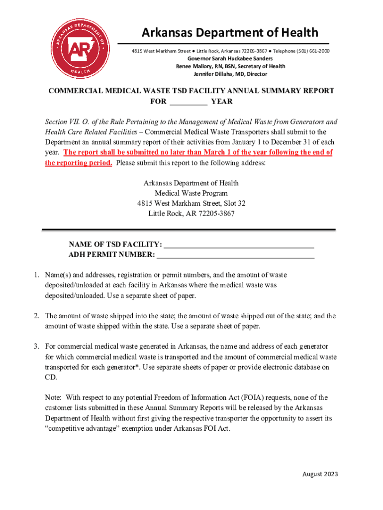 Get the free Commercial Medical Waste Tsd Facility Annual Summary Report - healthy arkansas