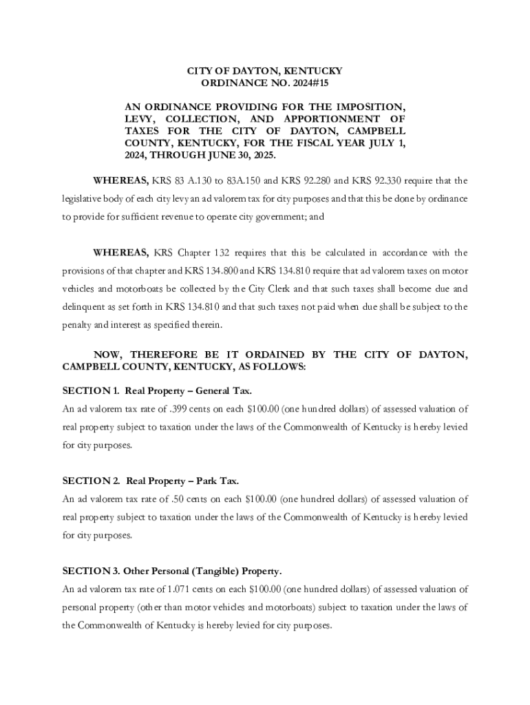 CITY OF DAYTON, KENTUCKY ORDINANCE NO. 2024#15 AN ORDINANCE PROVIDING FOR THE IMPOSITION, LEVY, COLLECTION, AND APPORTIONMENT OF TAXES FOR THE CITY OF DAYTON, CAMPBELL COUNTY, KENTUCKY, FOR THE FISCAL YEAR JULY 1, 2024, THROUGH JUNE 30, 2025. WHEREAS, KRS 83 A.130 to 83A.150 and KRS 92.280 and KRS 92.330 require that the legislative body of each city levy an ad valorem tax for city purposes and that this be done by ordinance to provide for sufficient revenue to operate city government; and...