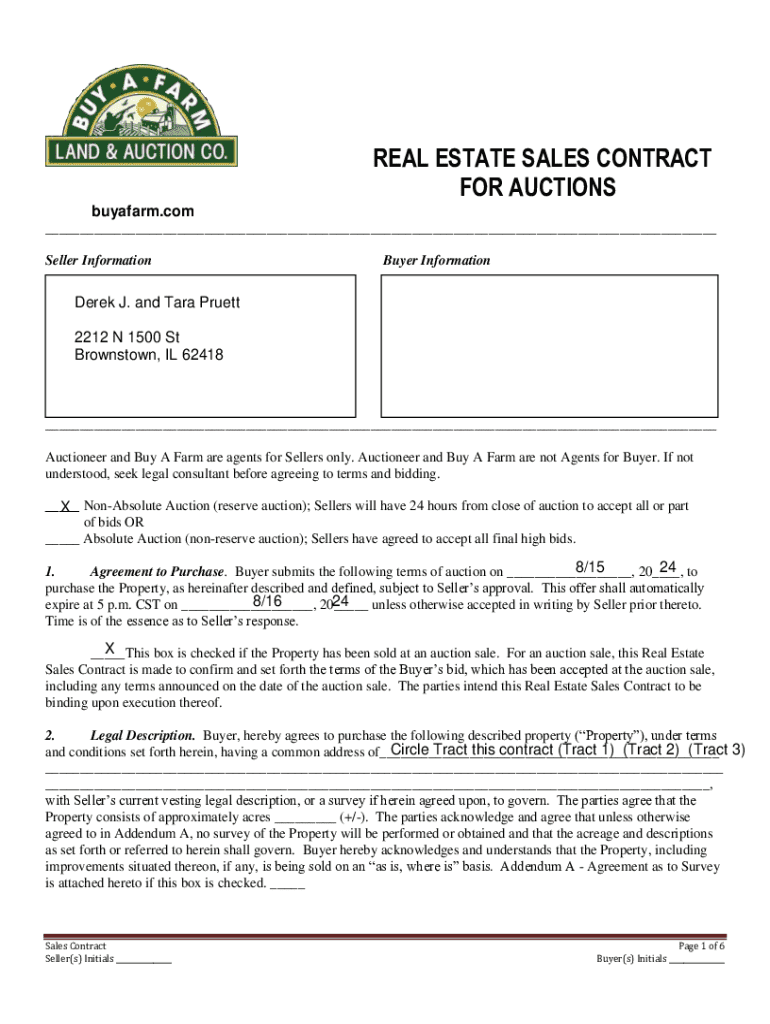 Este contrato de venta de bienes raíces establece los términos y condiciones bajo los cuales un comprador adquiere una propiedad a través de una subasta, incluyendo detalles sobre el precio de compra, la descripción legal de la propiedad, y las responsabilidades de ambas partes en el proceso de cierre.