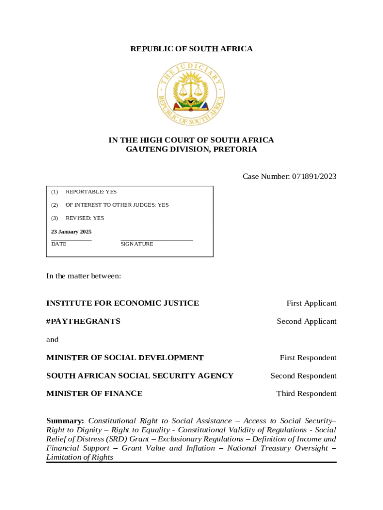 REPUBLIC OF SOUTH AFRICAIN THE HIGH COURT OF SOUTH AFRICA GAUTENG DIVISION, PRETORIA Case Number: 071891/2023 (1)REPORTABLE: YES(2)OF INTEREST TO OTHER JUDGES: YESIn the matter between: (3)REVISED: YES23 January 2025 ___ DATE___ SIGNATUREIn the matter between: INSTITUTE FOR ECONOMIC JUSTICE #PAYTHEGRANTSFirst Applicant Second Applicantand MINISTER OF SOCIAL DEVELOPMENT SOUTH AFRICAN SOCIAL SECURITY AGENCY MINISTER OF FINANCEFirst Respondent Second Respondent Third RespondentSummary: