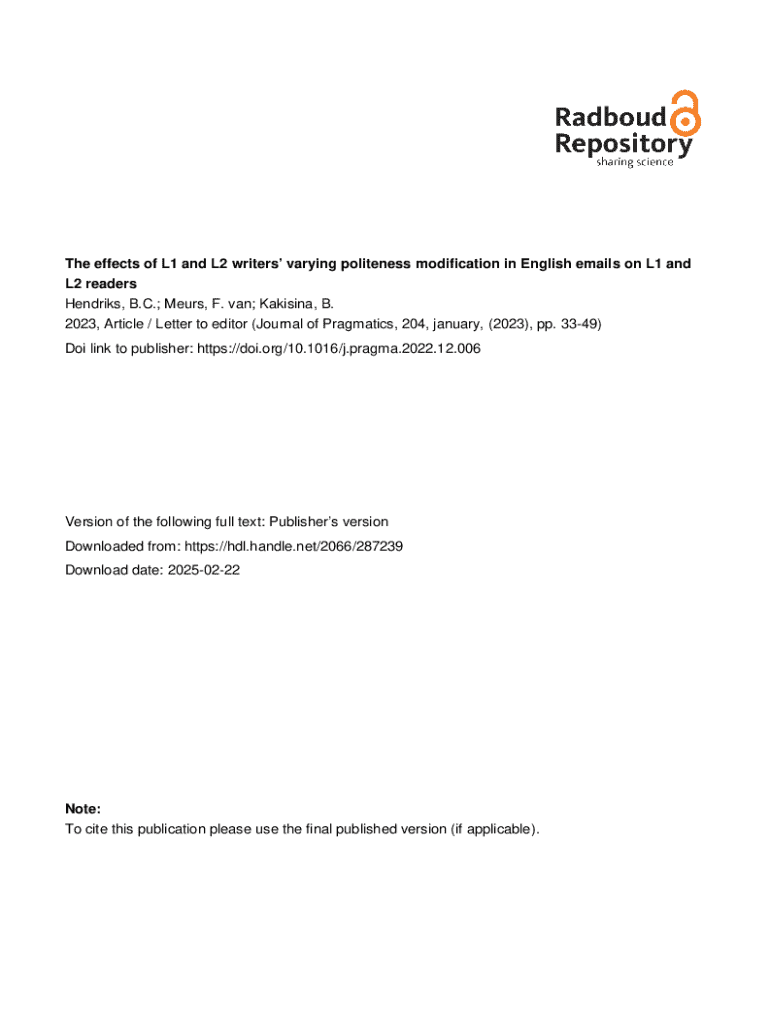 The effects of L1 and L2 writers varying politeness modification in English emails on L1 and L2 readers Hendriks, B.C.; Meurs, F. van; Kakisina, B. 2023, Article / Letter to editor (Journal of Pragmatics, 204, january, (2023), pp. 3349) Doi link to publisher: https://doi.org/10.1016/j.pragma.2022.12.006Version of the following full text: Publishers version Downloaded from: https://hdl.handle.net/2066/287239 Download date: 20250222Note: To cite this publication please use the final published...
