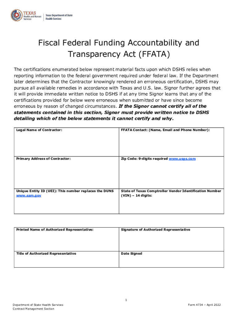 This certification form is required for contractors to certify various statements regarding their organization\'s funding, specifically concerning federal awards and related income disclosures. It includes questions regarding gross income, federal awards received, and public access to compensation information for senior executives.