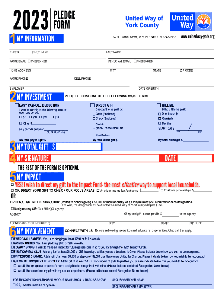 This form allows individuals to pledge contributions to the United Way of York County through various giving options, including payroll deduction, direct gifts, or billed gifts. It provides detailed sections for donor information, investment amounts, and preferred areas of contribution.