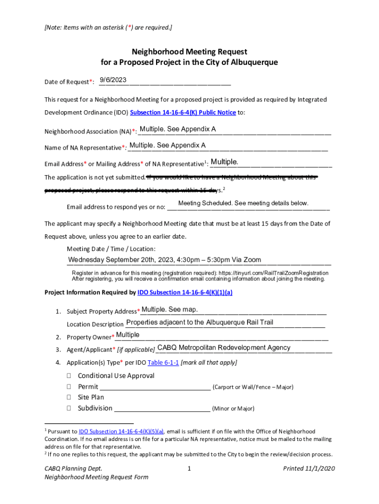 This form is a request for a Neighborhood Meeting related to a proposed project in Albuquerque, as required by the Integrated Development Ordinance (IDO). It includes details about the project, required information, and instructions for participants.