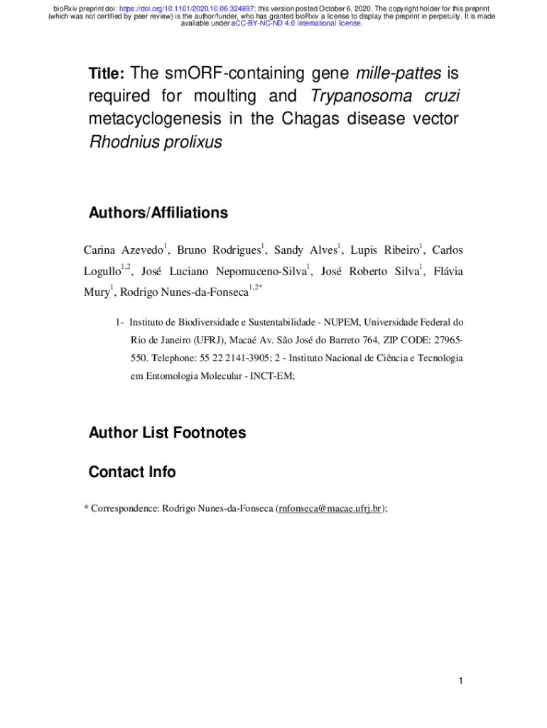 bioRxiv preprint doi: https://doi.org/10.1101/2020.10.06.324897; this version posted October 6, 2020. The copyright holder for this preprint (which was not certified by peer review) is the author/funder, who has granted bioRxiv a license to display the preprint in perpetuity. It is made available under aCCBYNCND 4.0 International license.Title: The smORFcontaining gene millepattes isrequired for moulting and Trypanosoma cruzi metacyclogenesis in the Chagas disease vector Rhodnius...