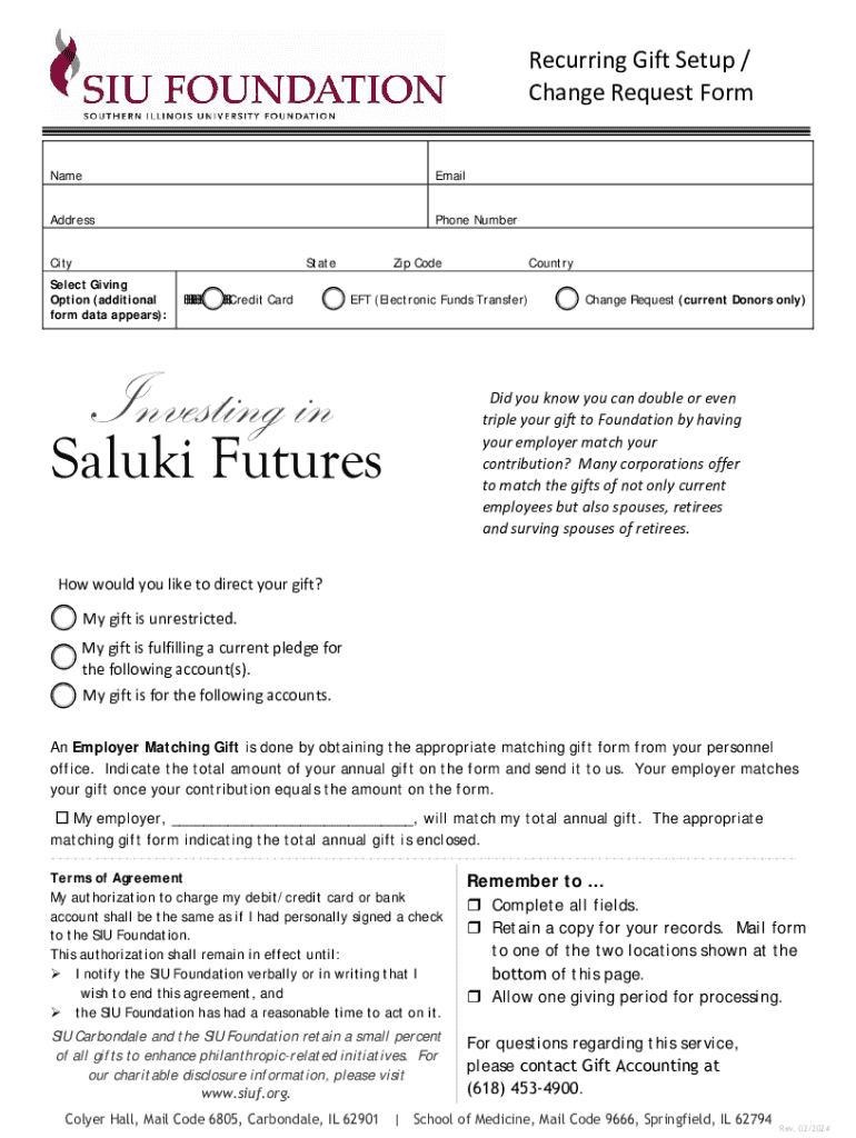 Este formulario permite a los donantes configurar o modificar sus donaciones recurrentes al SIU Foundation. Incluye información sobre opciones de donación, coincidencias de empleadores y términos de acuerdo.