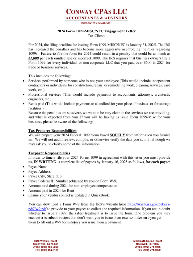This engagement letter outlines the responsibilities of both Conway CPAs LLC and the taxpayer regarding the preparation and filing of Form 1099-MISC/NEC for the tax year 2024. It emphasizes the importance of filing these forms accurately and on time to avoid penalties.