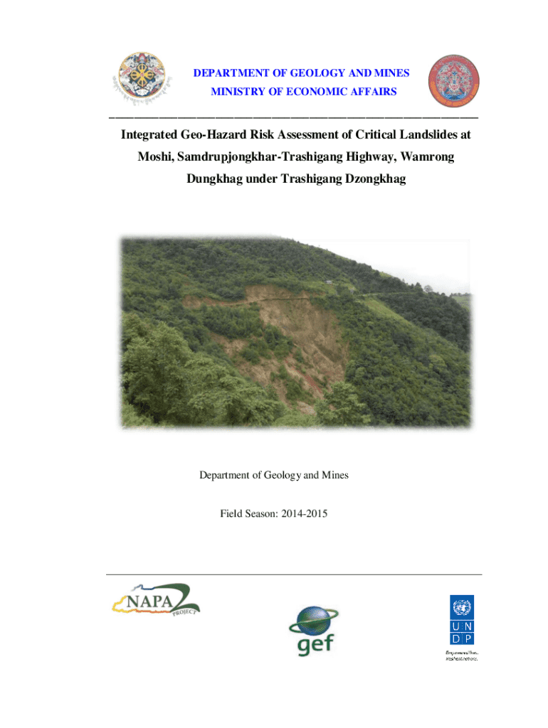 DEPARTMENT OF GEOLOGY AND MINES MINISTRY OF ECONOMIC AFFAIRS___ Integrated GeoHazard Risk Assessment of Critical Landslides at Moshi, SamdrupjongkharTrashigang Highway, Wamrong Dungkhag under Trashigang DzongkhagDepartment of Geology and MinesField Season: 20142015___DEPARTMENT OF GEOLOGY AND MINES MINISTRY OF ECONOMIC AFFAIRS___ Integrated GeoHazard Risk Assessment of Critical Landslides at Moshi, SamdrupjongkharTrashigang Highway, Wamrong Dungkhag under Trashigang DzongkhagDepartment