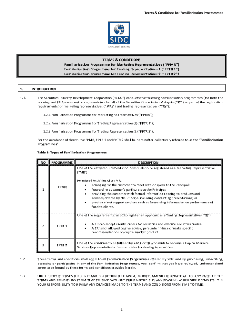 Terms & Conditions for Familiarisation ProgrammesTERMS & CONDITIONS Familiarisation Programme for Marketing Representatives (FPMR) Familiarisation Programme for Trading Representatives 1 (FPTR 1) Familiarisation Programme for Trading Representatives 2 (FPTR 2)1. 1.1.INTRODUCTION The Securities Industry Development Corporation (SIDC) conducts the following familiarisation programmes (for both the learning and FP Assessment components)on behalf of the Securities Commission
