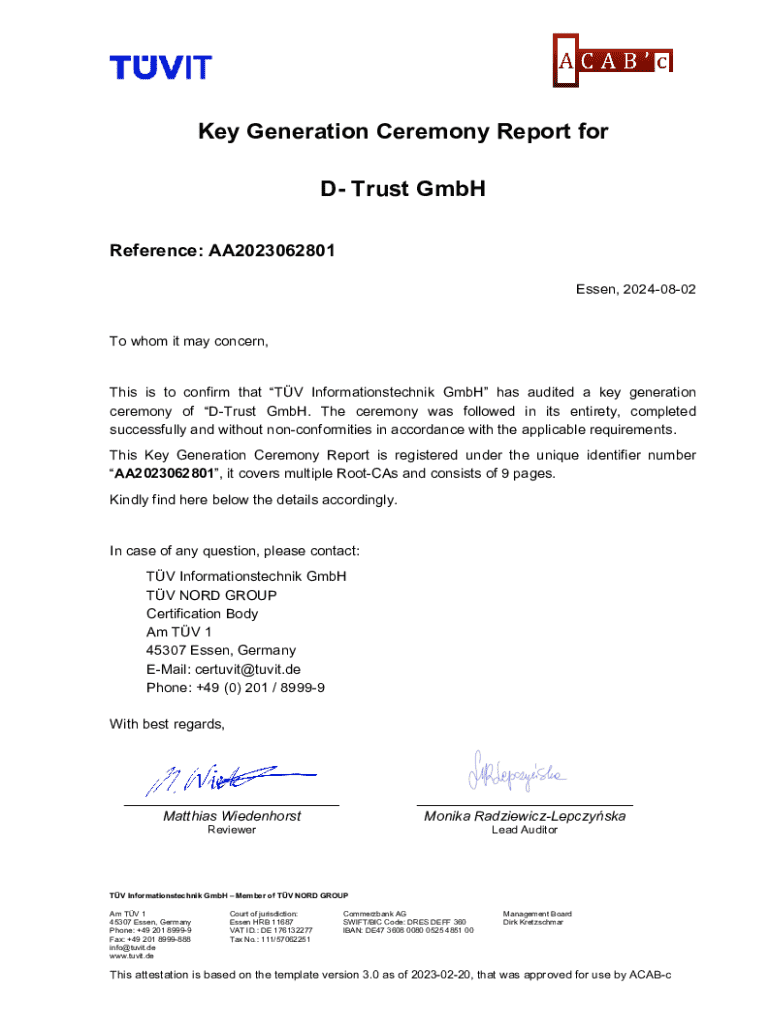 Key Generation Ceremony Report for D Trust GmbH Reference: AA2023062801 Essen, 20240802 To whom it may concern, This is to confirm that TV Informationstechnik GmbH has audited a key generation ceremony of DTrust GmbH. The ceremony was followed in its entirety, completed successfully and without nonconformities in accordance with the applicable requirements. This Key Generation Ceremony Report is registered under the unique identifier number AA2023062801, it covers multiple RootCAs and...