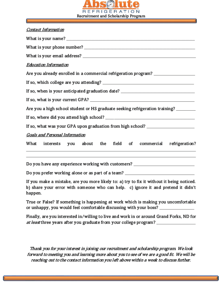 This document is an application form for individuals interested in joining a recruitment and scholarship program focused on commercial refrigeration. It collects information on contact details, education background, personal goals, and preferences related to the field.
