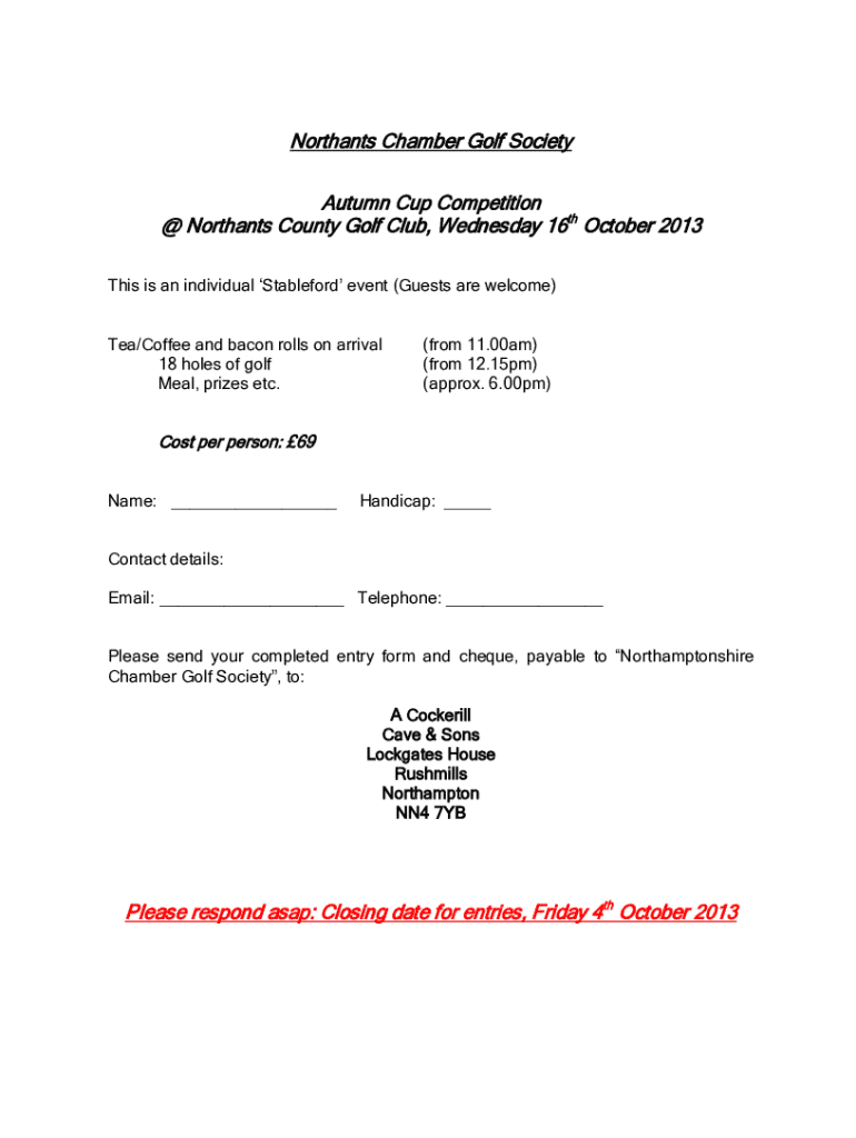Get the free Northants Chamber Golf Society Autumn Cup Competition Entry Form