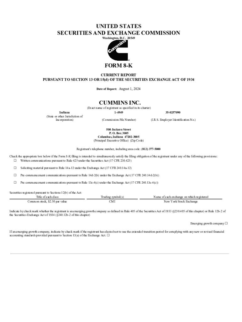 This document reports the results of operations and financial condition of Cummins Inc. for the second quarter of 2024, including record revenues, net income, and future outlooks regarding revenue