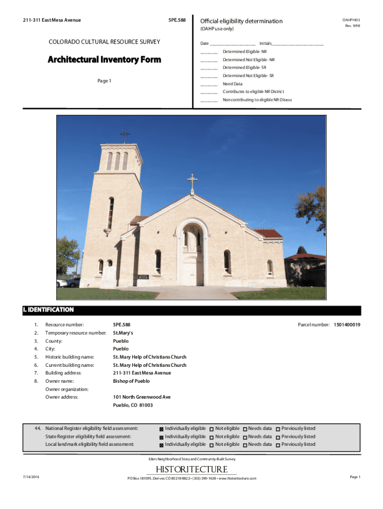 Este documento proporciona una evaluación de la elegibilidad histórica del sitio de la Iglesia de Santa María Ayuda de los Cristianos en Pueblo, Colorado, destacando su importancia arquitectónica