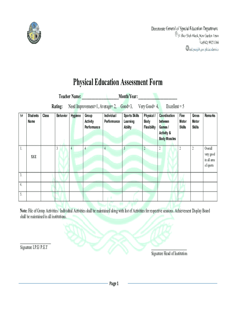Get the free Physical Education Assessment Form - sed punjab gov