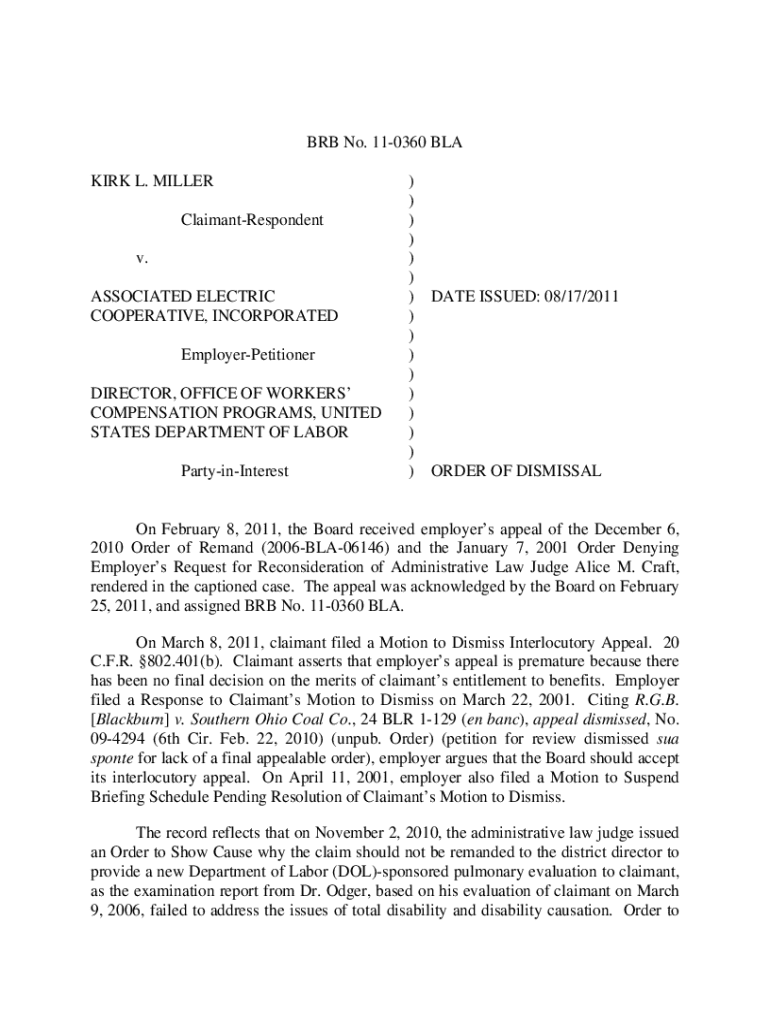 This document outlines the dismissal of an employer\'s interlocutory appeal regarding a remand order related to a claim for benefits under the Black Lung Benefits Act. It discusses the details of the case, the arguments from both parties, and the Board\'s conclusion that the appeal does not meet the necessary criteria for consideration.