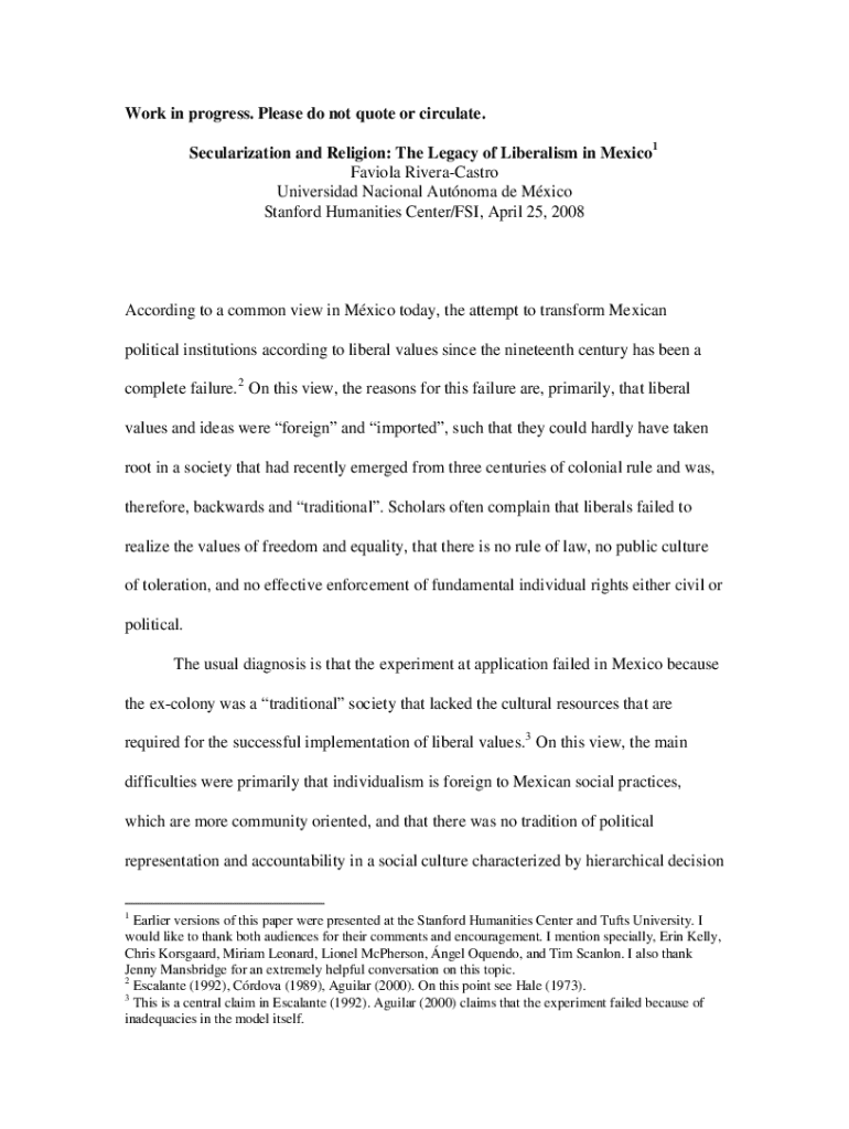 Work in progress. Please do not quote or circulate. Secularization and Religion: The Legacy of Liberalism in Mexico 1 Faviola RiveraCastro Universidad Nacional Autnoma de Mxico Stanford Humanities Center/FSI, April 25, 2008According to a common view in Mxico today, the attempt to transform Mexican political institutions according to liberal values since the nineteenth century has been a complete failure. 2 On this view, the reasons for this failure are, primarily, that liberal values and