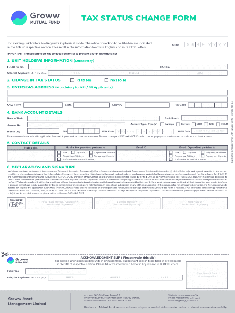 This form is intended for existing unitholders holding units in physical mode to change their tax status. It requires the submission of various details including unit holder\'s information, change in tax status, bank account details, and contact information. It also includes declarations related to compliance with tax regulations.