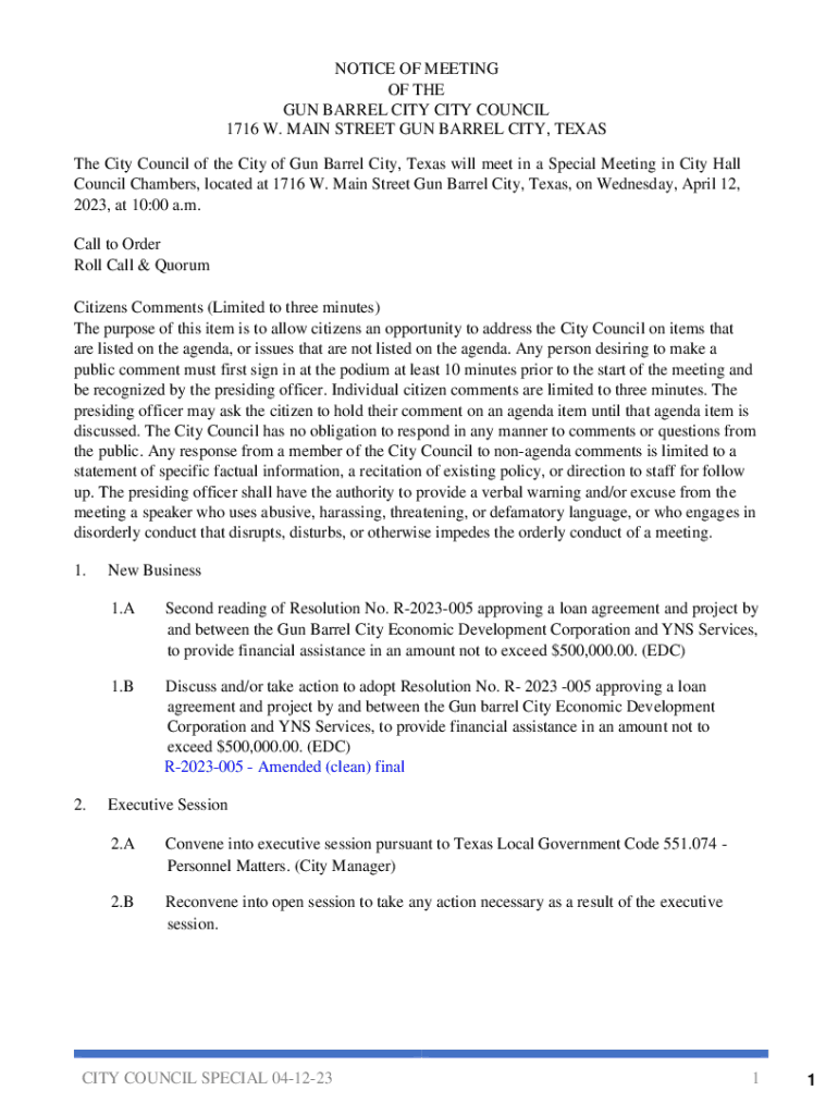 This document serves as a notice for the Special Meeting of the Gun Barrel City City Council, detailing the agenda, citizen comments, new business items including resolutions concerning a loan agreement,