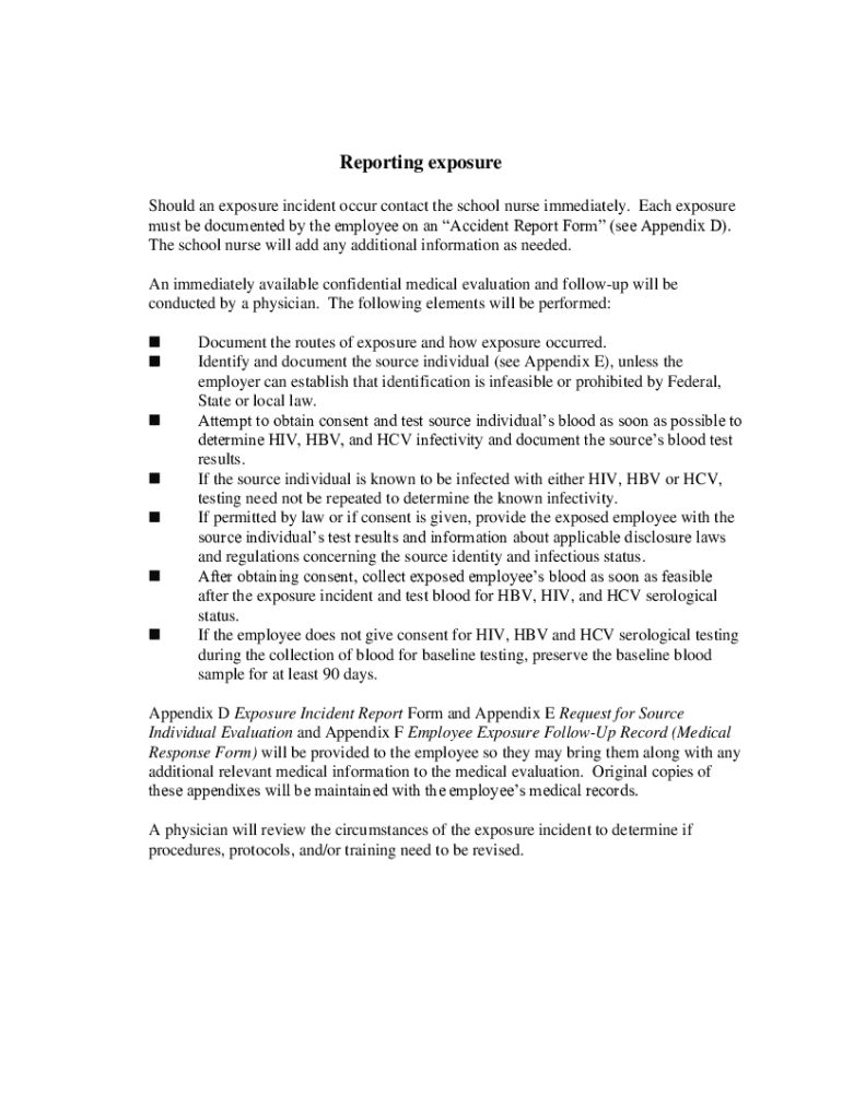 This document outlines the procedures and protocols for reporting exposure incidents, including documentation requirements for exposure, medical evaluation, and follow-up actions related to bloodborne pathogen exposure.