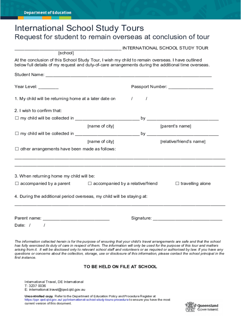 This document serves as a request for parents to indicate their wishes for their child to remain overseas after the conclusion of the School Study Tour, including details on travel arrangements and duty-of-care considerations.