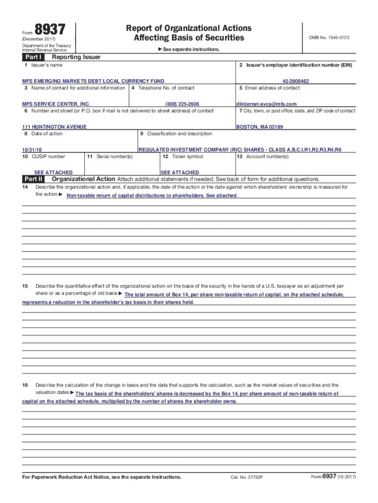 Form 8937 is a tax form used to report organizational actions that affect the basis of a security. It is primarily filed by corporations and partnerships to provide information to the IRS and shareholders about changes in the financial structure of securities.