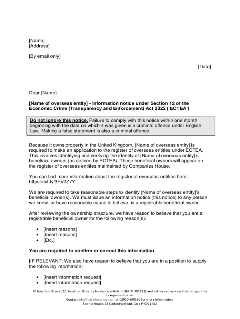 [Name] [Address] [By email only] [Date]Dear [Name] [Name of overseas entity] Information notice under Section 12 of the Economic Crime (Transparency and Enforcement) Act 2022 (ECTEA) Do not ignore this notice. Failure to comply with this notice within one month beginning with the date on which it was given is a criminal offence under English Law. Making a false statement is also a criminal offence. Because it owns property in the United Kingdom, [Name of overseas entity] is required to
