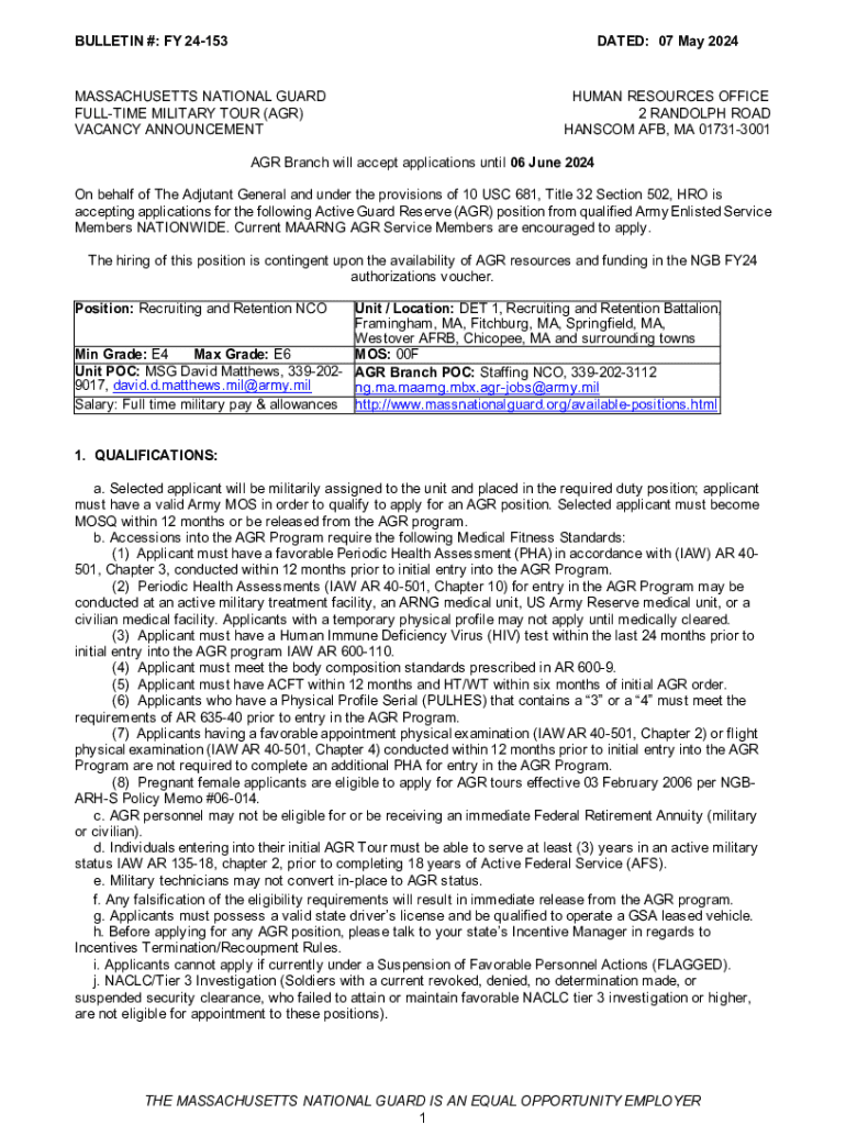 This bulletin is a vacancy announcement for the Active Guard Reserve (AGR) position of Recruiting and Retention NCO with the Massachusetts National Guard. It provides information on qualifications, application procedures, and requirements for applicants, including medical fitness standards and documentation needed for submission.
