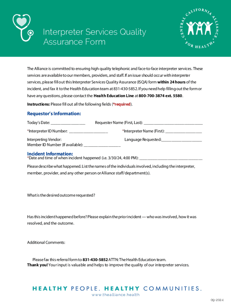 The Alliance is committed to ensuring high quality telephonic and face-to-face interpreter services. This form is to be filled out within 24 hours of any incident related to interpreter services.