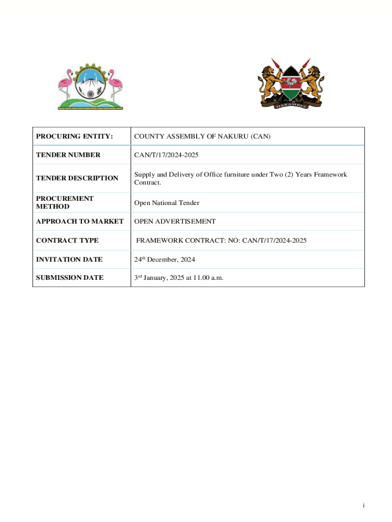 This document details the requirements and procedures for the tender invited by the County Assembly of Nakuru for the supply and delivery of office furniture under a two-year framework contract. It outlines the procurement method, eligibility criteria, submission process, contract terms, and technical specifications.