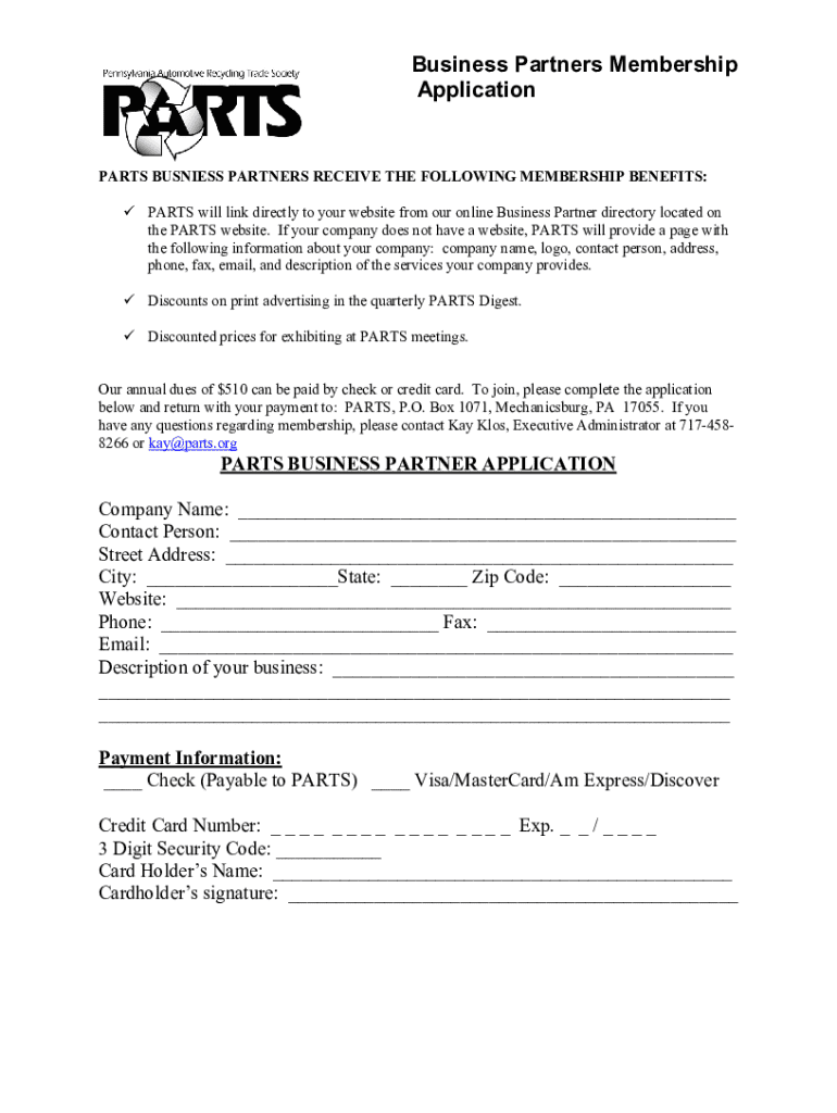 This document is an application form for becoming a business partner with PARTS, detailing membership benefits, application requirements, and payment information.