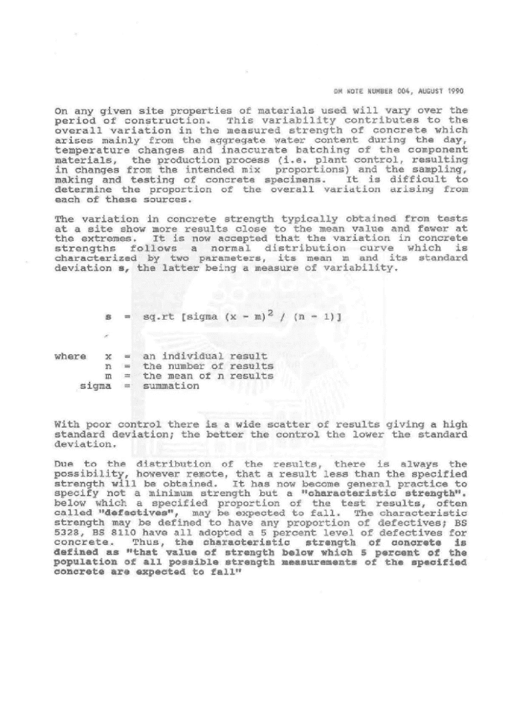This document provides guidelines on the variability of concrete strength, characterization of concrete strength, and the necessary parameters to consider during concrete mix design. It defines characteristic strength, the influence of tensile strength, and discusses the requirements and testing methods for concrete performance and durability, specifically focusing on tensile strength, compressive strength, and other related parameters impacting structural integrity over time.