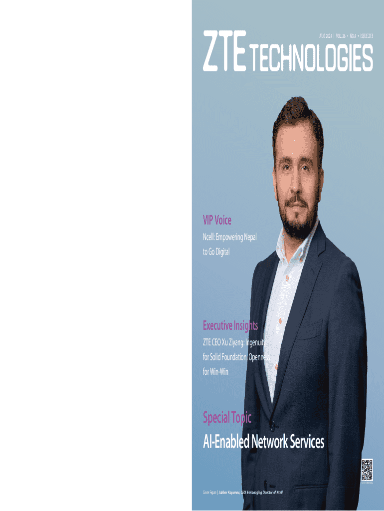 AUG 2024VOL. 26NO.4ISSUE 213VIP Voice Ncell: Empowering Nepal to Go DigitalExecutive Insights ZTE CEO Xu Ziyang: Ingenuity for Solid Foundation, Openness for WinWinSpecial TopicAIEnabled Network Services Scan for mobile readingCover Figure Jabbor Kayumov, CEO & Managing Director of NcellCONTENTS VIP Voice 02 Ncell: Empowering Nepal to Go Digital Reporter: Luo JinfengZTE TECHNOLOGIES AUG 2024VOL. 26NO. 4Executive InsightsISSUE 213Advisory Committee Director: Liu Jian06