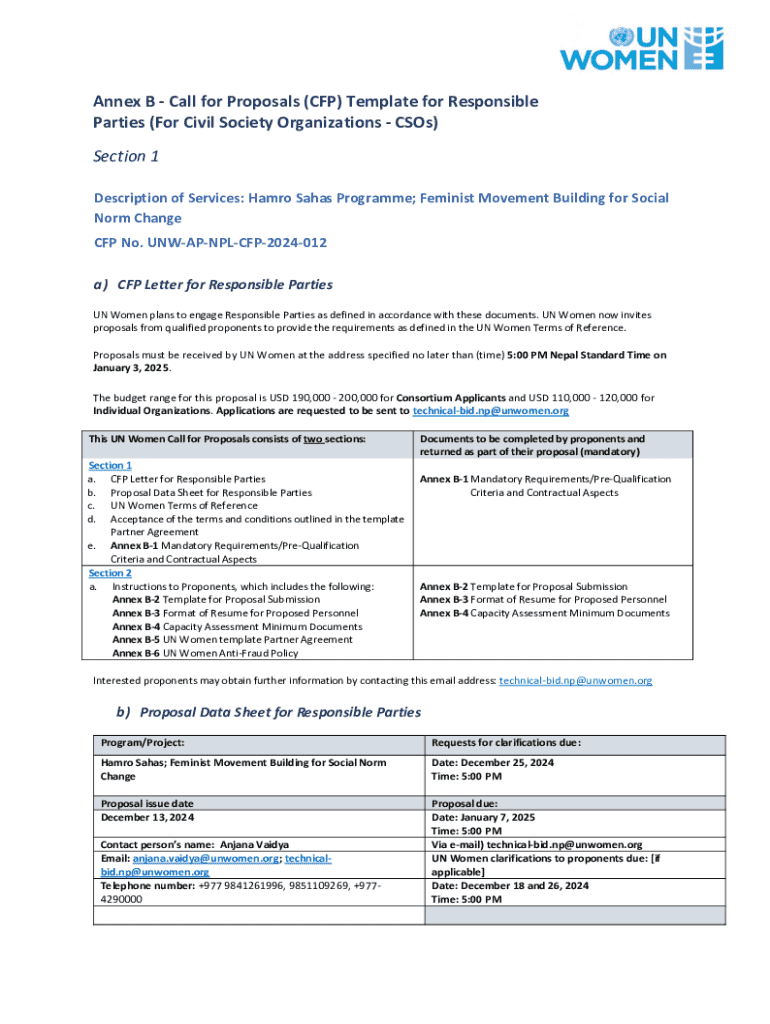 UN Women plans to engage Responsible Parties to provide services for the Hamro Sahas Programme aimed at advancing gender equality and supporting women\'s rights organizations in Nepal. The Call for Proposals invites qualified organizations to submit proposals addressing gender discriminatory social norms, focusing on capacity building, resource access, and gender transformation.