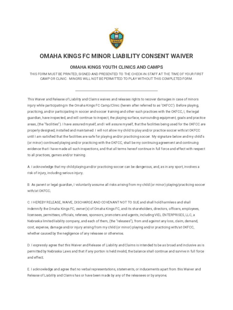 This waiver and release form is required for minors participating in Omaha Kings FC camps and clinics, acknowledging the risks involved in soccer and releasing the organization from liability.