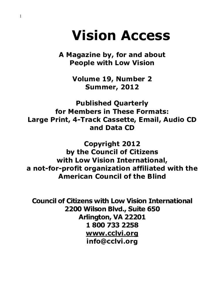 1Vision Access A Magazine by, for and about People with Low Vision Volume 19, Number 2 Summer, 2012 Published Quarterly for Members in These Formats: Large Print, 4Track Cassette, Email, Audio CD