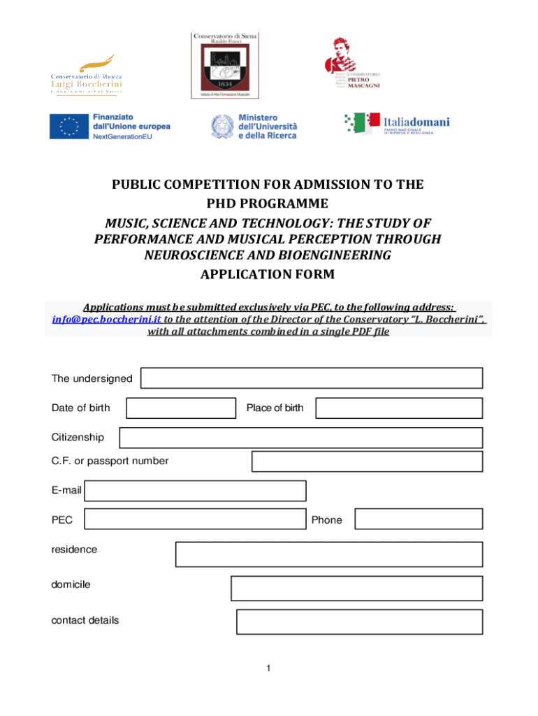 Application form for admission to the AFAM PhD programme in Music, Science and Technology, focusing on performance and musical perception through neuroscience and bioengineering.