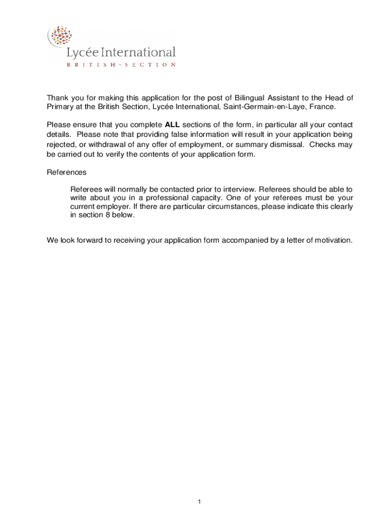 This application form is for candidates applying for the position of Bilingual Assistant to the Head of Primary at the British Section, Lycée International, Saint-Germain-en-Laye, France. The form