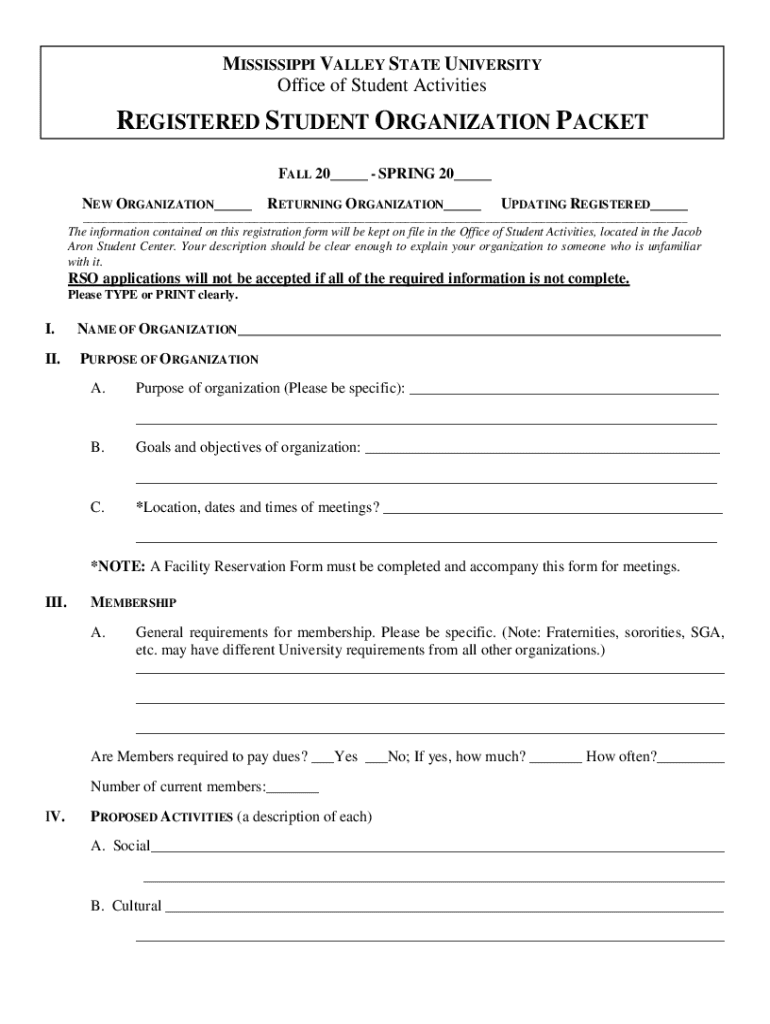 This packet is for the registration of new, returning, or updating registered student organizations at Mississippi Valley State University. It includes sections for providing information about the