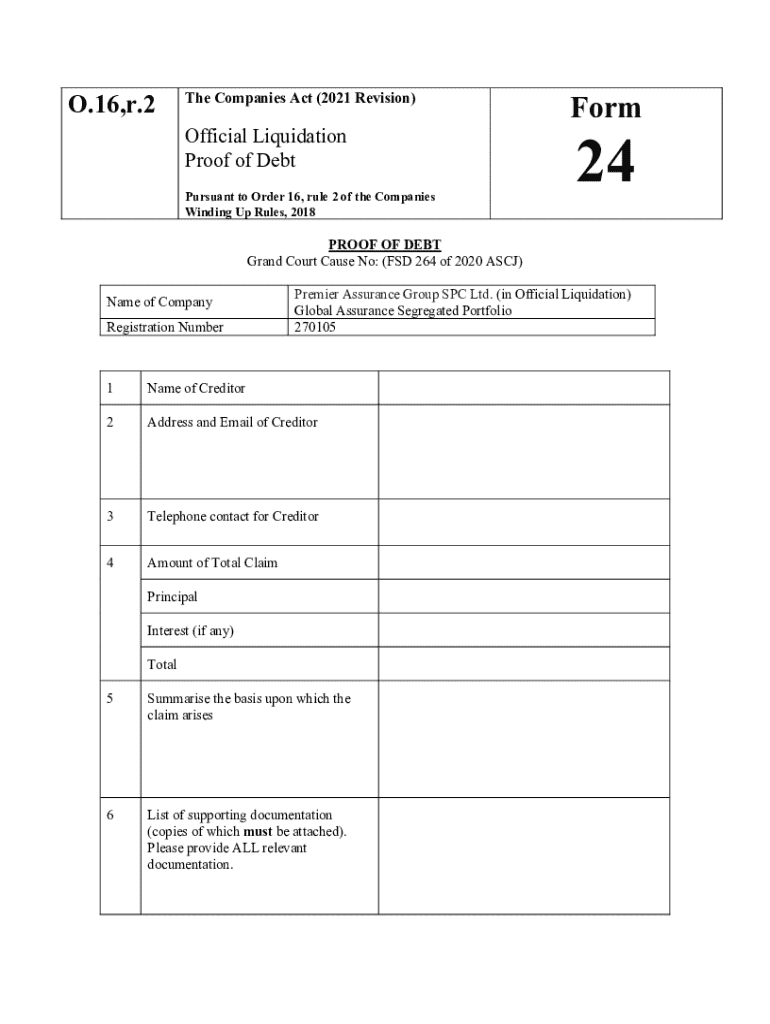 This form is used for submitting a claim by a creditor in the official liquidation process of Premier Assurance Group SPC Ltd., pursuant to Order 16, rule 2 of the Companies Winding Up Rules, 2018.