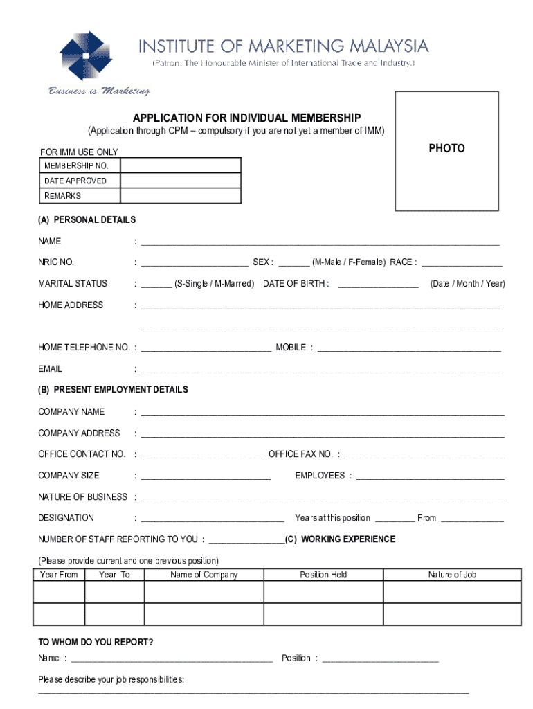 This document is an application form for individual membership to the Institute of Marketing Malaysia (IMM). It requires personal, employment, and educational details as well as a declaration for