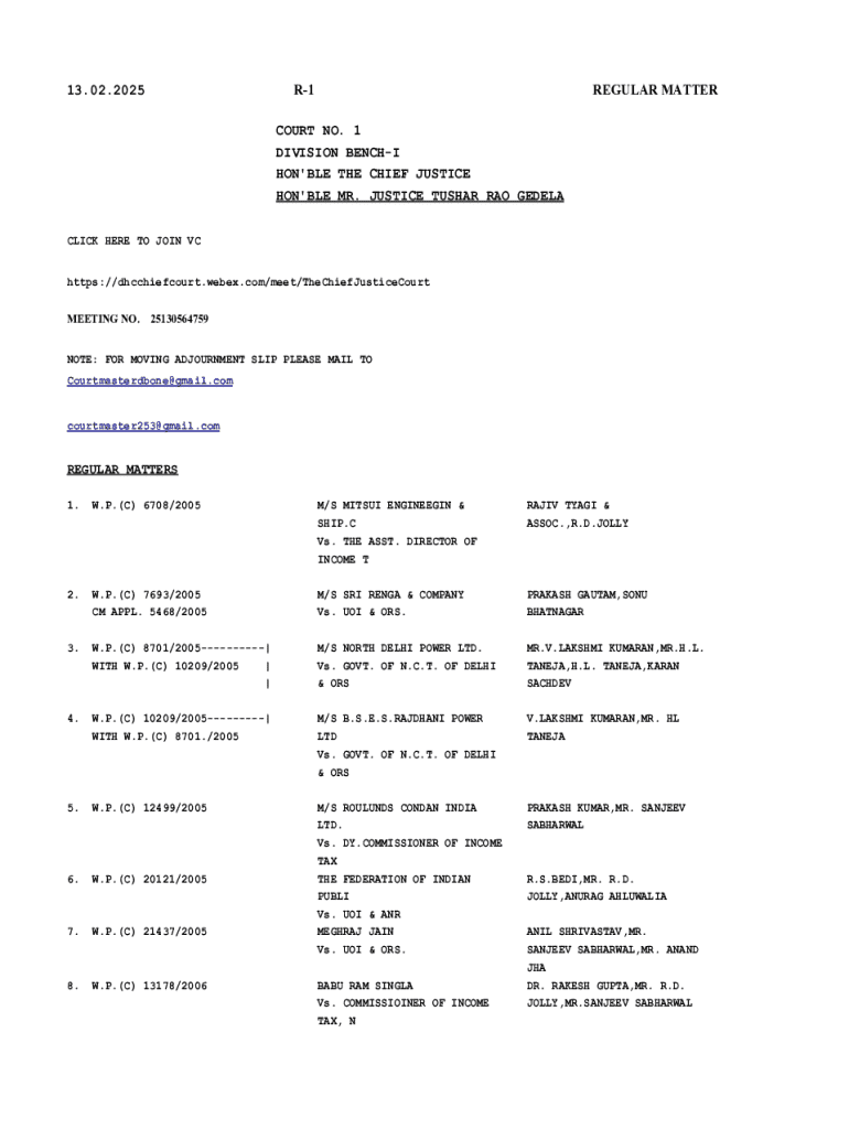 R113.02.2025REGULAR MATTERCOURT NO. 1 DIVISION BENCHI HON\'BLE THE CHIEF JUSTICE HON\'BLE MR. JUSTICE TUSHAR RAO GEDELA CLICK HERE TO JOIN VC https://dhcchiefcourt.webex.com/meet/TheChiefJusticeCourt