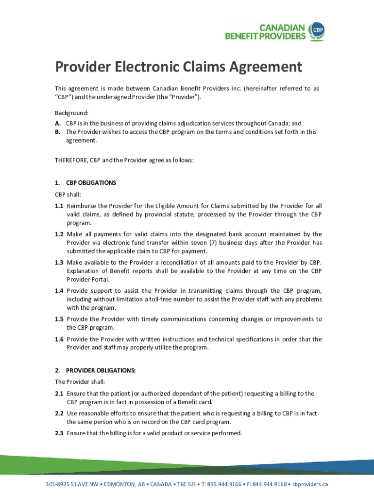 Provider Electronic Claims Agreement This agreement is made between Canadian Benefit Providers Inc. (hereinafter referred to as CBP) and the undersigned Provider (the Provider). Background: A. CBP