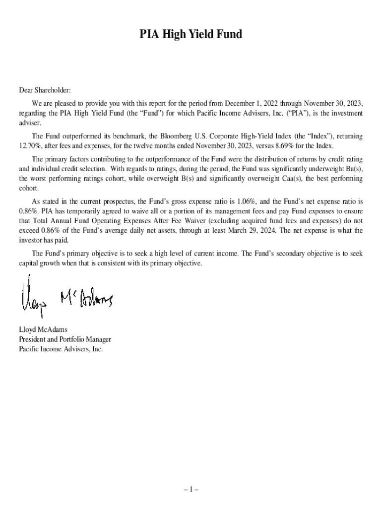 This document provides a comprehensive report on the PIA High Yield Fund\'s performance, financial statements, investment strategies, and risk factors for the fiscal year ended November 30, 2023.