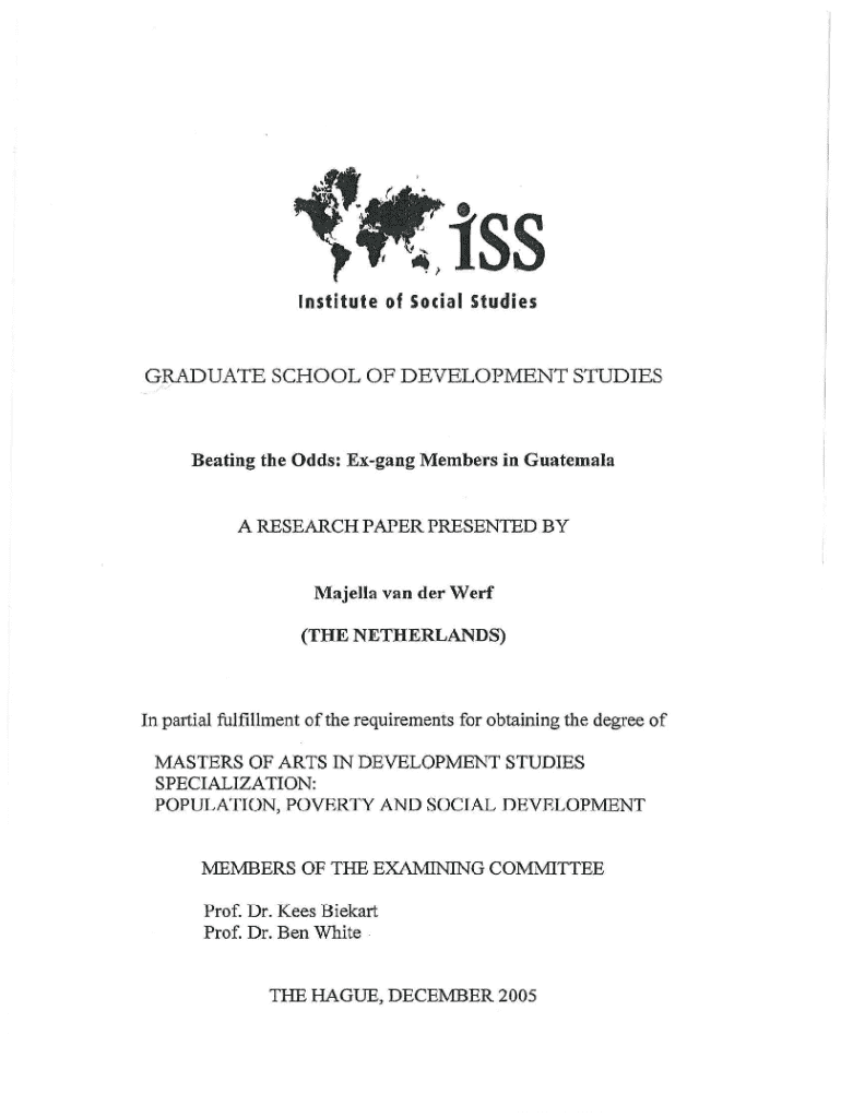 ,iSS Institute of Social StudiesGRADUATE SCHOOL OF DEVELOPMENT STUDIESBeating the Odds: Exgang Members in GuatemalaA RESEARCH PAPER PRESENTED BYMajella van der Werf (THE NETHERLANDS)In partial fulfillment