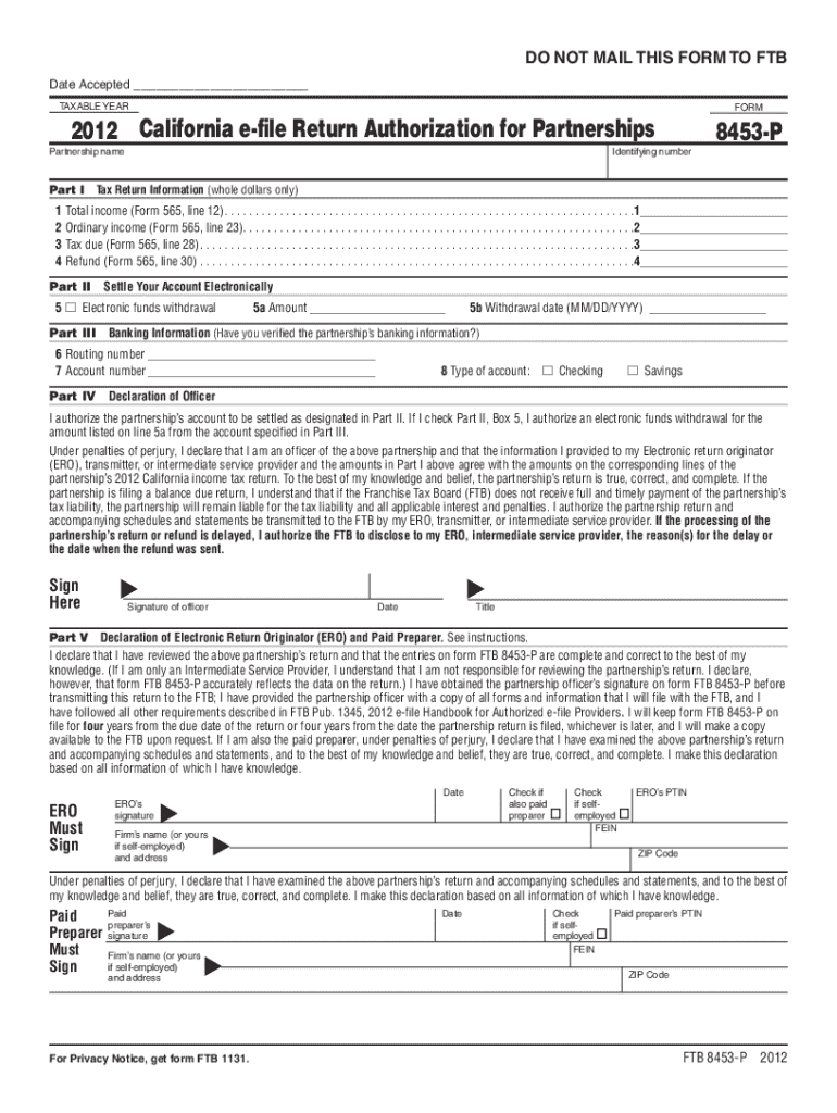 Partnerships that e-file their California Partnership tax returns must file FTB 8453-P to authorize the tax professional to e-file on their behalf.