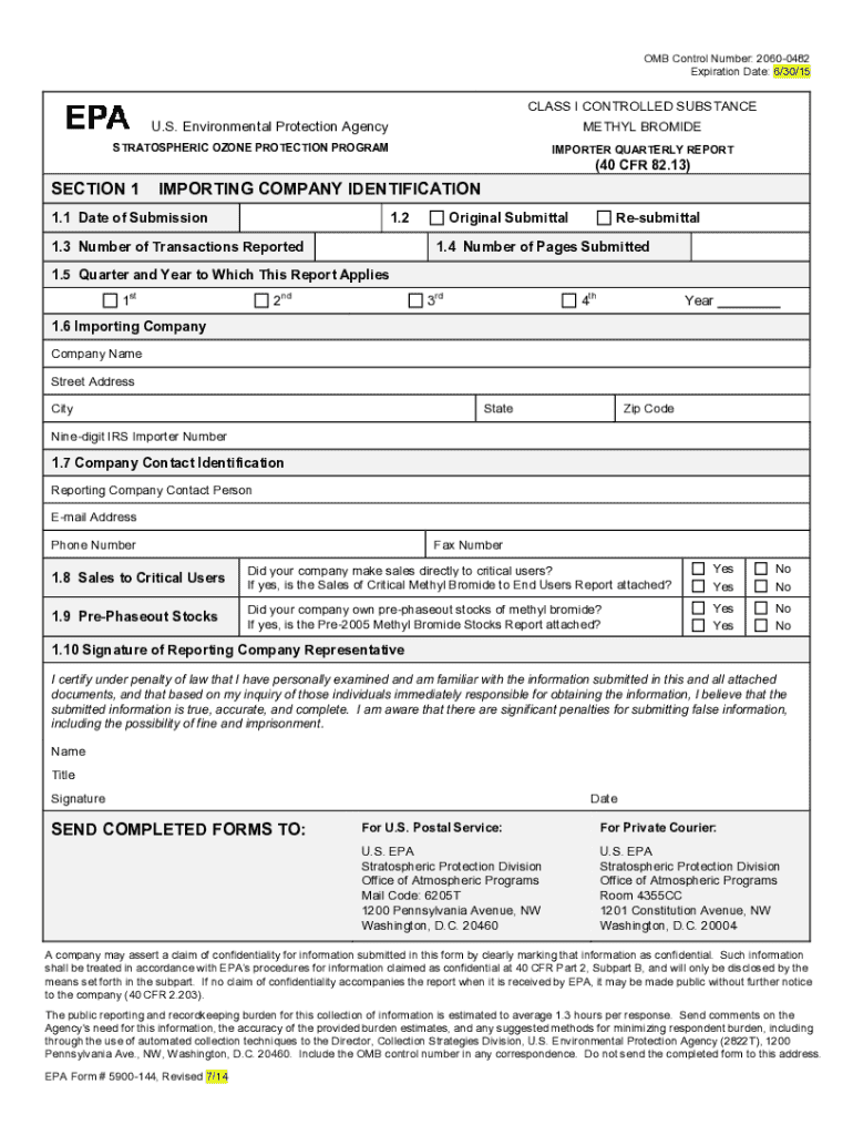 This form is required by the U.S. Environmental Protection Agency for companies importing methyl bromide to report their transactions and compliance with the Stratospheric Ozone Protection Program.