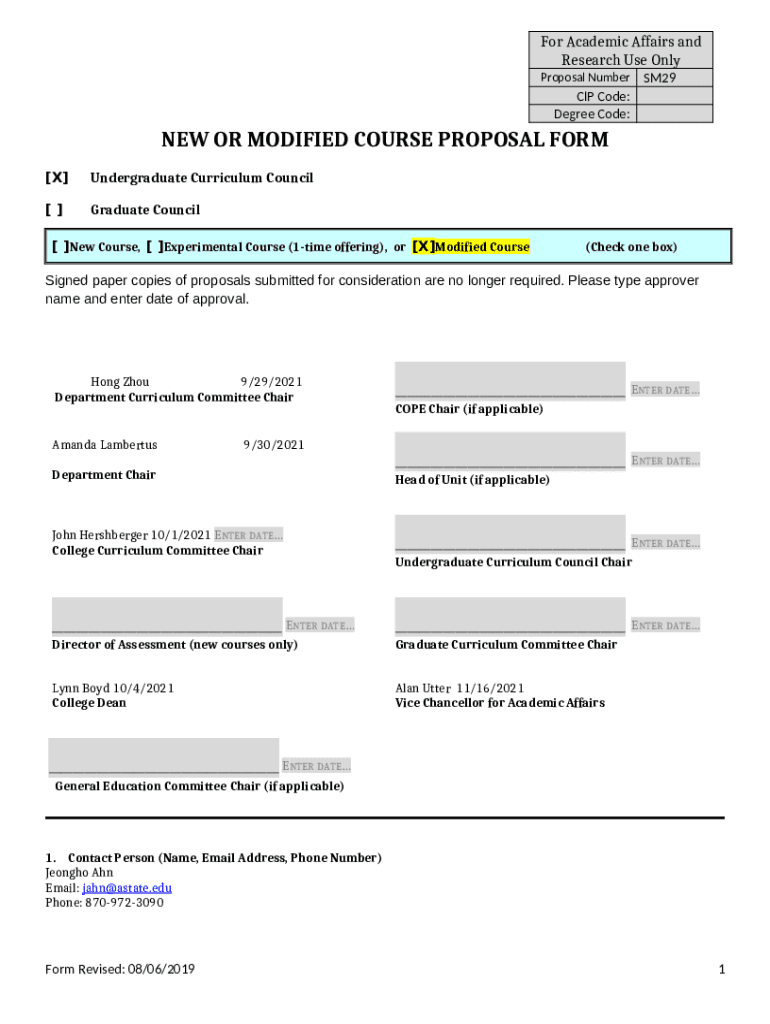 The New or Modified Course Proposal is a Word document needed to be submitted to the relevant address in order to provide some info. It must be completed and signed, which can be done in hard copy, or with the help of a particular software e. g. PDFfiller. It lets you fill out any PDF or Word document right in the web, customize it depending on your requirements and put a legally-binding e-signature. Right after completion, the user can easily send the New or Modified Course Proposal to the appropriate person, or multiple ones via email or fax. The blank is printable too because of PDFfiller feature and options offered for printing out adjustment. In both electronic and in hard copy, your form will have a neat and professional look. Also you can save it as the template for later, there's no need to create a new file from the beginning. You need just to customize the ready template.