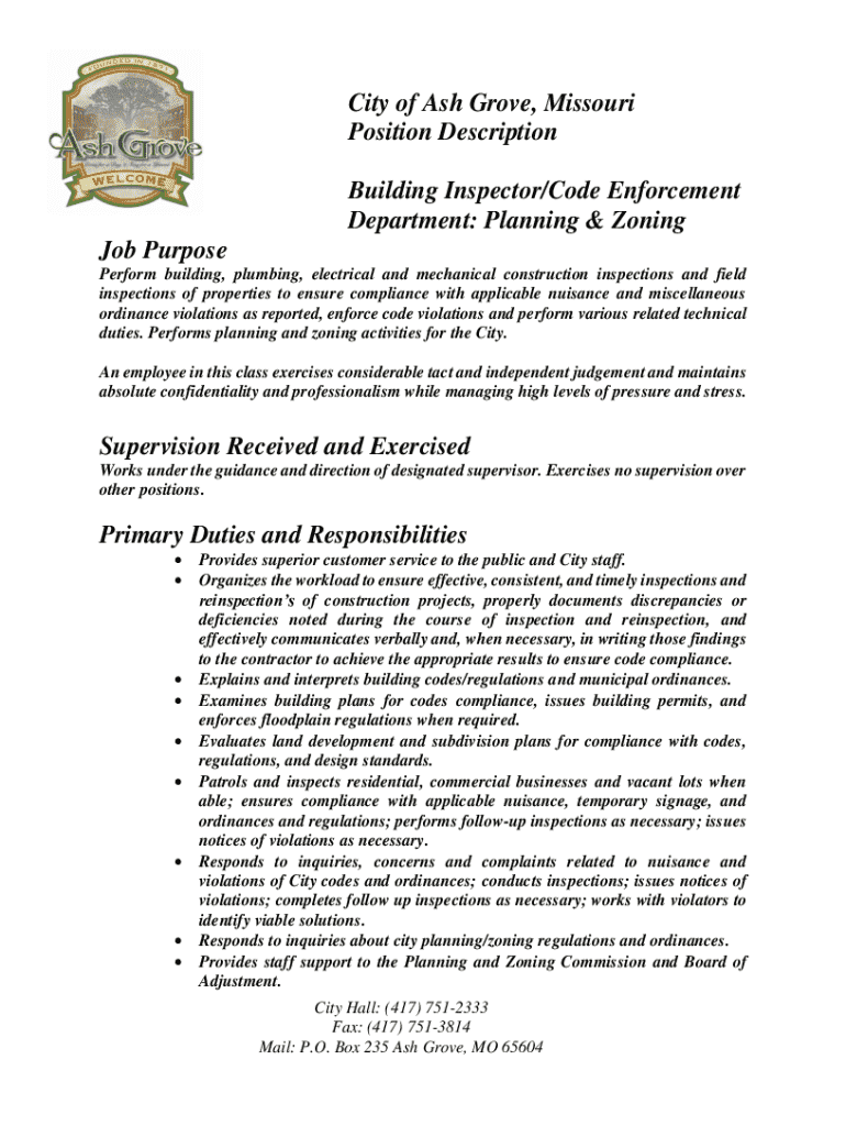 This document outlines the duties, responsibilities, requirements, and working conditions for the position of Building Inspector/Code Enforcement in the City of Ash Grove, Missouri. It includes information