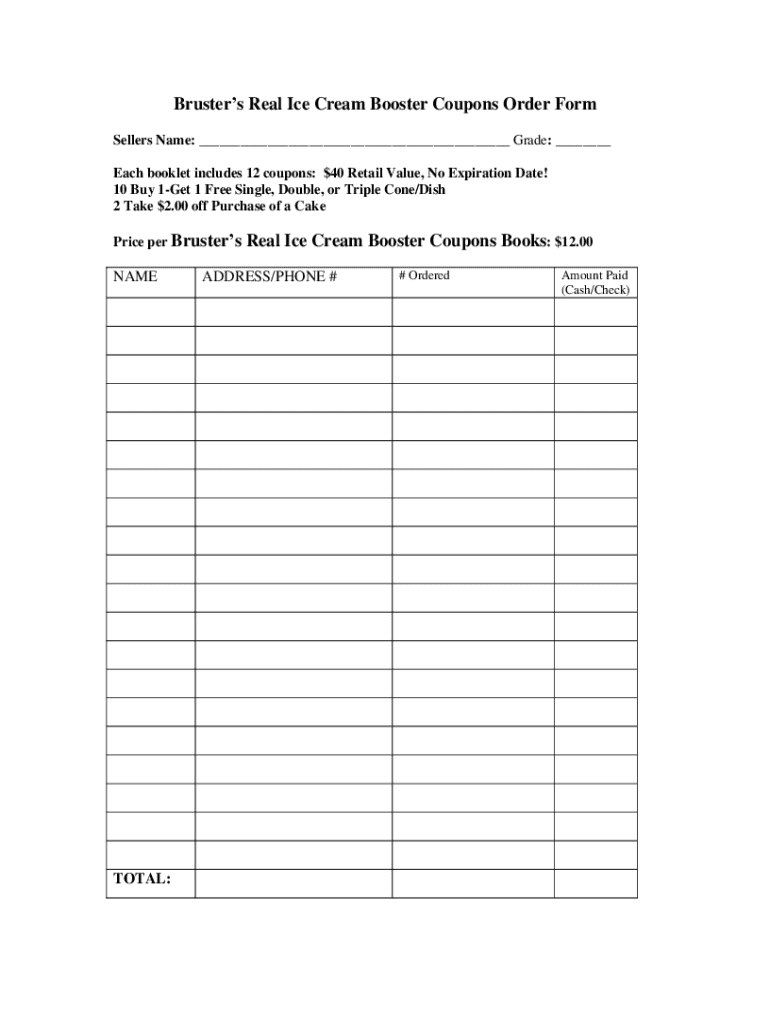 Order form for Bruster’s Real Ice Cream Booster Coupons which includes 12 coupons with a retail value of $40, featuring offers such as Buy 1-Get 1 Free cones and discounts on cakes.
